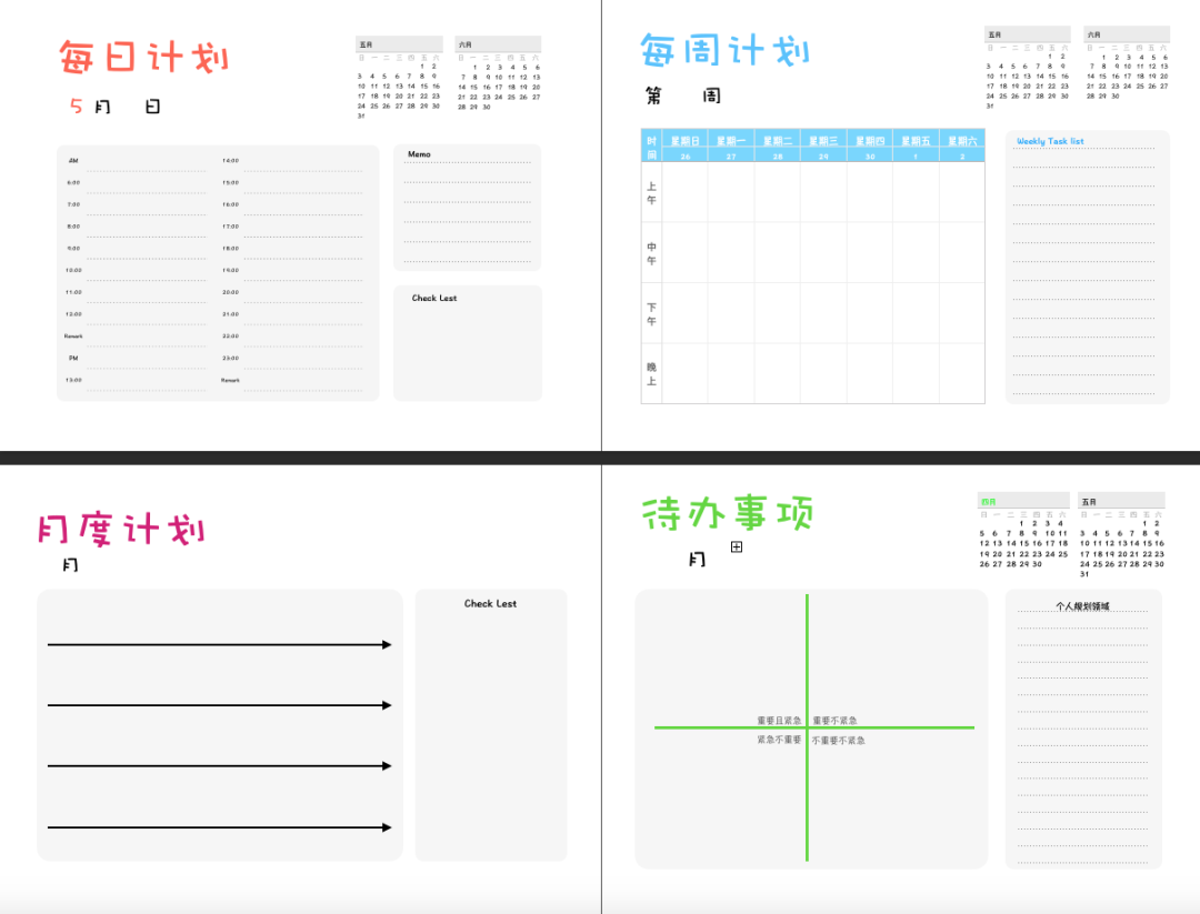 然后要有一个时间规划本,可以在每天早上或者晚上花点时间来安排计划。这个我觉得也可以按照自己的习惯来弄,我渐渐习惯了无纸化的学习环境,我就会自己设计制作自己的计划本,然后用iPad来记录📝,我自己的每日计划有很多的风格,在GoodNote有一套,还设计了一套壁纸可以在iPad上快速的查看当天的计划。最后一定一定不要受他人的影响,打乱自己的计划,不断完成、不断完善自己计划和方式。也是要不断的在错误中吸取经验,不断的去试错,才会找到属于自己的,适合自己的最好的方式。